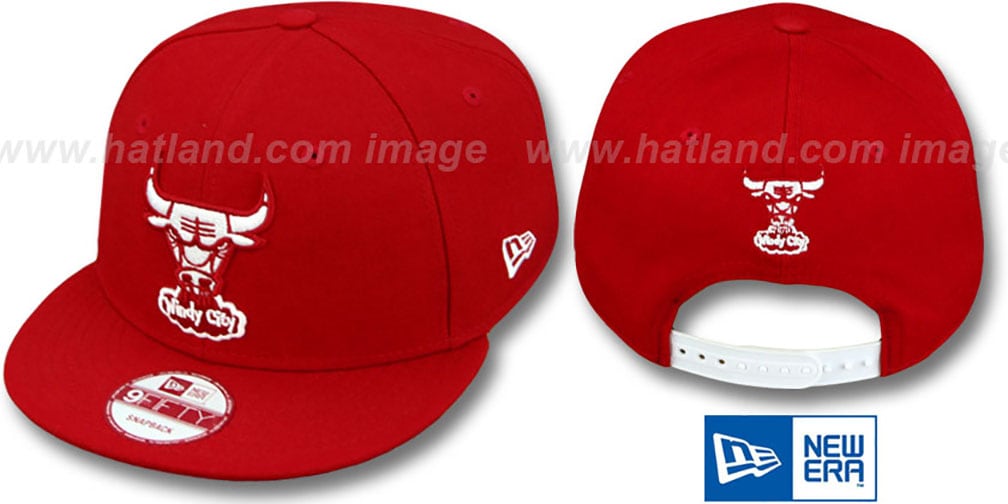 Original fit 9Fifty adjustable wool hat by New Era that has similar deep crown and flat brim fit as the 59-Fifty, red crown and visor and undervisor, raised embroidered team logo on front in white and red, white plastic adjustable Snapback strap . This Chicago Bulls hat is made by New Era and is licensed by the NBA - National Basketball Association.