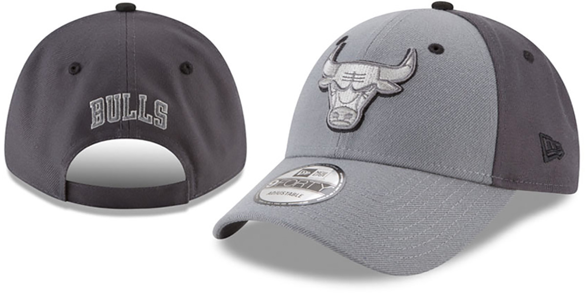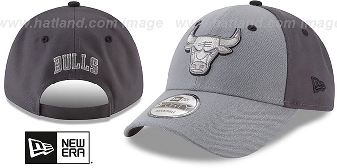 New Era 9FORTY low-profile authentic poly adjustable fit hat by New Era, light grey front panels and visor and undervisor with charcoal grey mid and back panels, raised embroidered team logo on front in greys and black outline, New Era logo on side, matching embroidered secondary team logo on back above matching adjustable velcro strap. This Chicago Bulls hat is made by New Era and is licensed by the NBA - National Basketball Association.