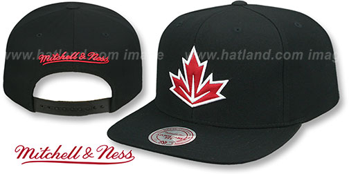 World Cup Hockey Snapback by Mitchell and Ness with deep crown and flat brim, poly/wool blend black crown and visor with light grey undervisor, embroidered Team Canada Hockey logo on front in red-white, matching embroidered Mitchell and Ness above matching adjustable snapback closure. This Team Canada hat is made by Mitchell & Ness and is licensed by the World Cup of Hockey.