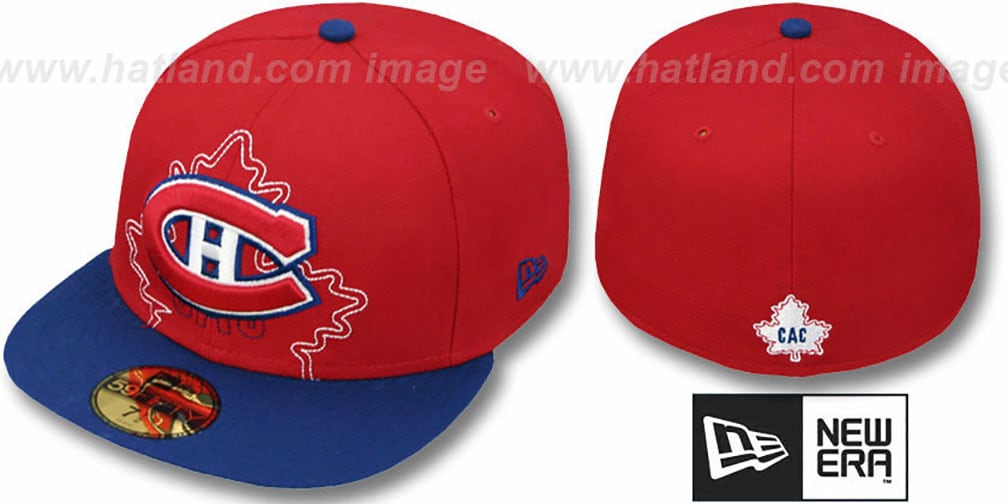 Authentic and ORIGINAL 59FIFTY wool fitted hat by New Era, red wool deep crown, royal blue visor and undervisor, oversized secondary team logo shadow stitching around raised embroidered team logo on front, embroidered secondary team logo on back. This item is on SALE!. This Montreal Canadiens baseball cap is made by New Era and is licensed by the NHL - National Hockey League.