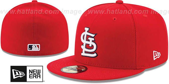 MLB Authentic Collection and ORIGINAL 59FIFTY fitted performance poly hat by New Era, red deep crown and visor, black undervisor, raised embroidered team logo on front, embroidered New Era logo on side, raised embroidered MLB logo on back, This is the style of Onfield hat worn by all MLB teams during the MLB season. This St Louis Cardinals baseball cap is made by New Era and is licensed by the MLB - Major League Baseball.