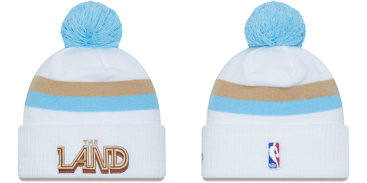 100% acrylic white crown with light tan and sky blue stripes on knit beanie, raised embroidered City Edition logo on front of white ribbed cuff, embroidered New Era logo on side, raised embroidered NBA logo on back, matching pom-pom on top, matching pom-pom on top, Produced to match NBA City Edition Jerseys and hats worn throughout select 2022-2023 games. This Cleveland Cavaliers hat is made by New Era and is licensed by the NBA - National Basketball Association.