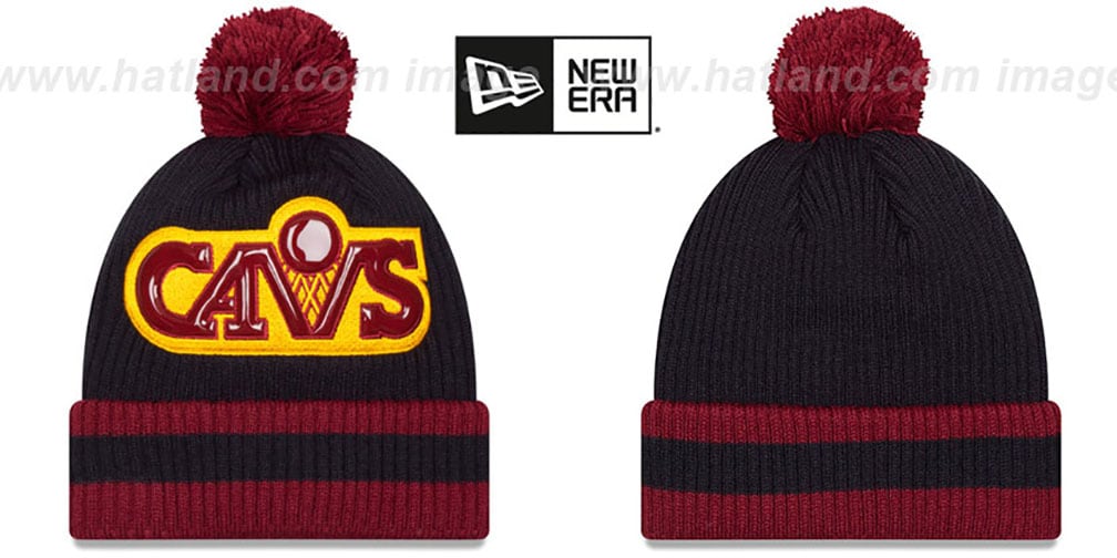 Hardwood Classic acrylic knit Beanie by New Era, Extra-Large embroidered Hardwood team logo on front with shiny p/u fill, navy blue knit crown with burgundy and navy striped knit cuff, small New Era logo embroidered on side, team color pom-pom on top. This Cleveland Cavaliers merchandise is made by New Era and is licensed by the NBA National Basketball Association.