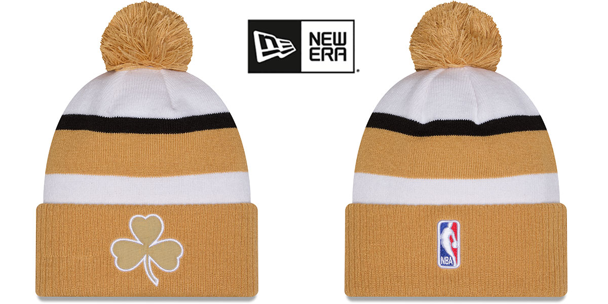 100% acrylic knit beanie crown with horizontal stripes, raised embroidered City Edition logo on front of old gold (tan) ribbed cuff, embroidered New Era logo on side, raised embroidered NBA logo on back, old gold (tan) pom-pom on top, Produced to match NBA City Edition Jerseys and hats worn throughout select 2025-2026 games. This Boston Celtics hat is made by New Era and is licensed by the NBA - National Basketball Association.