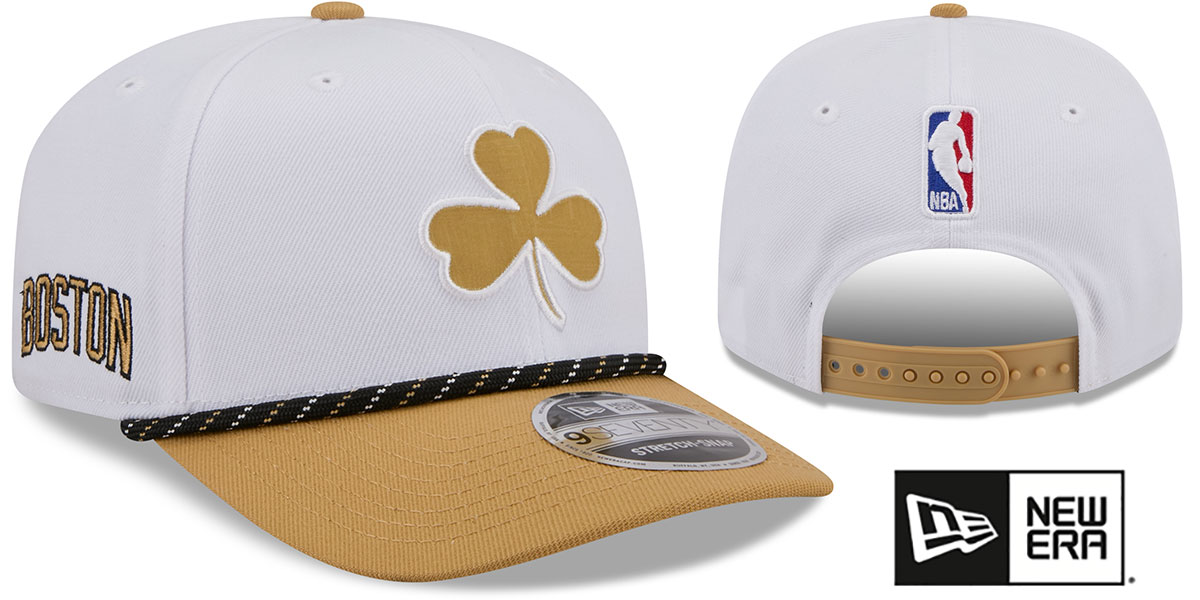 The New Era Low Profile 9SEVENTY STRETCH SNAP hat features a structured, rounded crown and pre-curved visor, white authentic poly crown and old gold (tan) visor that features a matching rope, light grey undervisor, black sweatband, embroidered City Edition logo on front, embroidered New Era logo on side, matching embroidered City Edition design logo on opposite side, raised embroidered NBA logo on back in white with red and royal fill above matching stretch snap closure, Produced to match NBA City Edition Jerseys worn throughout select 2025-2026 games. This Boston Celtics hat is made by New Era and is licensed by the NBA - National Basketball Association.
