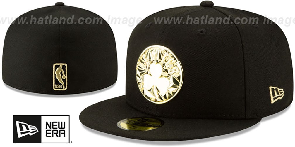Authentic and ORIGINAL 59Fifty fitted hat by New Era, black authentic poly deep crown and visor, black undervisor, fractured gold metal badge team logo attached to front, matching embroidered New Era logo on side, matching raised embroidered NBA logo on back . This Boston Celtics hat is made by New Era and is licensed by the NBA - National Basketball Association.