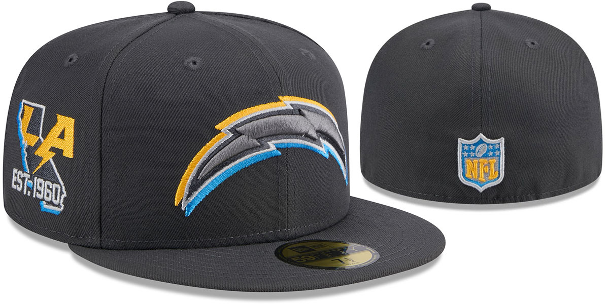This charcoal gray, 59FIFTY fitted cap by New Era features a deep, authentic poly crown and visor, a light gray undervisor, and a raised, embroidered team logo in gray tones with a team color shadow effect on the front. The cap also includes a California 'EST. 1960' side patch, an embroidered team-colored NFL shield logo on the back, and an embroidered New Era logo on the opposite side. This is the 59FIFTY cap worn during the 2024 NFL Draft. This Los Angeles Chargers baseball cap is made by New Era and is licensed by the NFL National Football League.