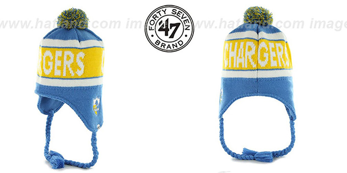 Sky (light) blue acrylic ribbed knit crown with team color gold and white striping and large team name knit in stripe, embroidered team logo on side, matching two team color pom-pom on top, 47 Brand tag on side of flaps with sky blue tassles. This item is on SALE!. This San Diego Chargers hat is made by 47 Brand and is licensed by the NFL National Football League.