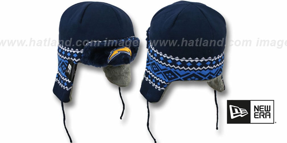 Navy blue ribbed knit crown with opposite team color pattern on ear flaps, embroidered team logo on front fur flip, grey fur lining, matching draw strings. This San Diego Chargers hat is made by New Era and is licensed by the NFL National Football League.