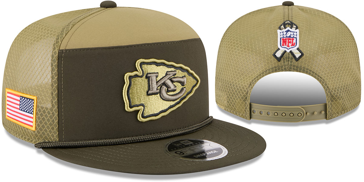 Show your support with the Chiefs 2025 Salute to Service Split Panel 9FIFTY Trucker. This 100% Quill Tech polyester fabric cap features an embroidered team logo on the front, an NFL Salute to Service patch above the adjustable snapback closure, and an American flag patch on the right side. Rope embellishment extends across the visor. Finished with a silicone team logo on the dark green undervisor, while digi-camo fabric lines the interior for a bold finish. Proceeds from Salute to Service products benefit the NFL’s military nonprofit partners. This Kansas City Chiefs hat is made by New Era and is licensed by the NFL - National Football League.