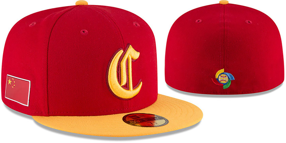 Authentic and ORIGINAL 59Fifty fitted performance poly hat by New Era, red deep crown and gold visor, light grey undervisor, raised embroidered World Baseball Classic team logo on front, China flag liquid chrome patch on side, embroidered New Era logo on opposite side, embroidered WBC logo on rear of hat. This is the style of On-field hat worn by all teams during the World Baseball Classics. This hat is made by New Era and is licensed by the WBC World Baseball Classic.