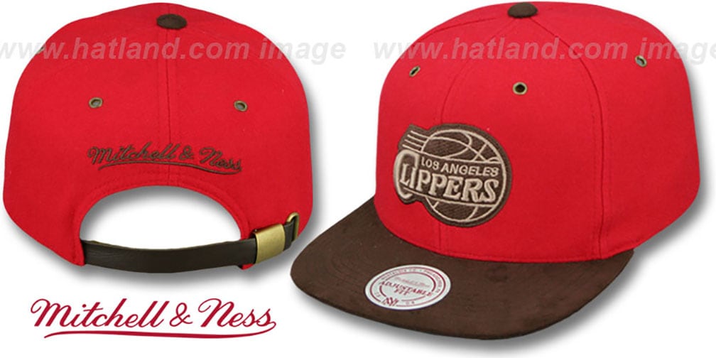 Original fit adjustable wool blend hat by Mitchell & Ness that has deep crown and flat brim, Melton Wool red crown with brown Suede visor and matching button, dark green undervisor, embroidered team logo on front in matching brown and tan, metal eyelets, Mitchell & Ness embroidered over back opening, brown leather strapback with metal buckle snap closure. This Los Angeles Clippers hat is made by Mitchell & Ness and is licensed by the NBA - National Basketball Association.