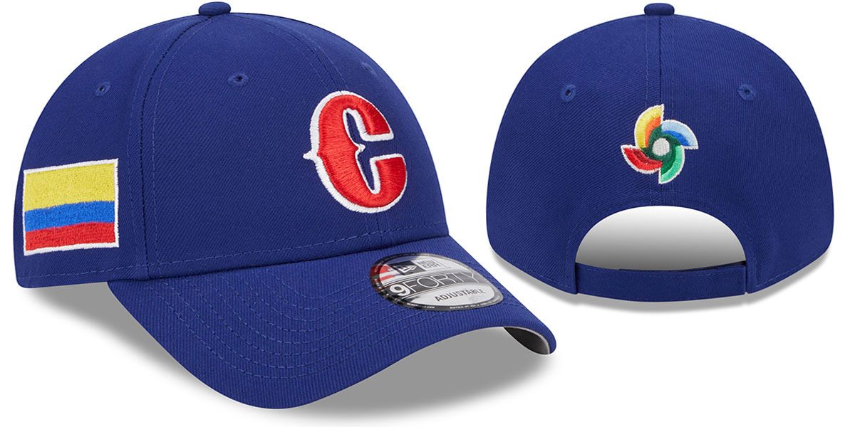 Authentic 9FORTY strapback hat by New Era with a lightly structured rounded crown and curved brim, royal blue authentic poly crown and visor, light grey undervisor, raised embroidered World Baseball Classic team logo on front, embroidered country flag on side, embroidered WBC logo on back above matching Velcro strap closure, This is the curved brim style of On-field hat worn by all teams during the 2023 World Baseball Classic. This hat is made by New Era and is licensed by the WBC World Baseball Classic.