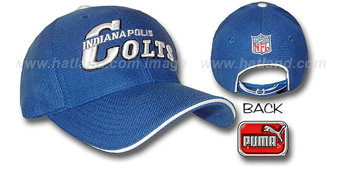 2000 NFL Coaches Sideline Hat, rounded structured team color wool blend crown and visor, city name embroidered on front above 'raised' white embroidered team name with team outline, secondary color sandwich brim, NFL shield on back, adjustable velcro back closure with 'cyclone' woven pattern on strap.PUMAcycloneindcol. This Indianapolis Colts hat is made by Puma and is licensed by the NFL - National Football League.