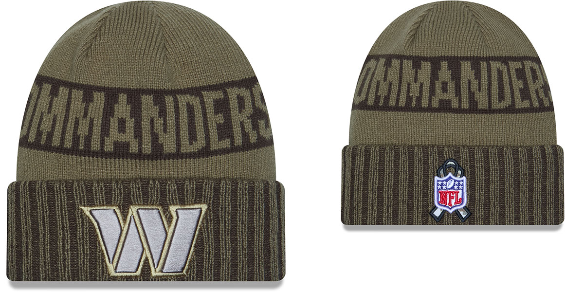 Show your pride on and off the field with the 2025 Salute to Service Cuff Knit. This cold-weather essential features the Commanders logo at the front, a bold team wordmark across the crown, and tribute details including the American flag patch on the side and the official NFL Salute to Service patch at the back. Built for warmth and comfort with 100% Acrylic Crown & Cuff and 90% Polyester/10% Wool Lining. It’s more than just game-day gear—it’s a way to honor those who serve. Every purchase helps support the NFL’s military nonprofit partners. Hand wash, dry flat. This Washington Commanders hat is made by New Era and is licensed by the NFL National Football League.