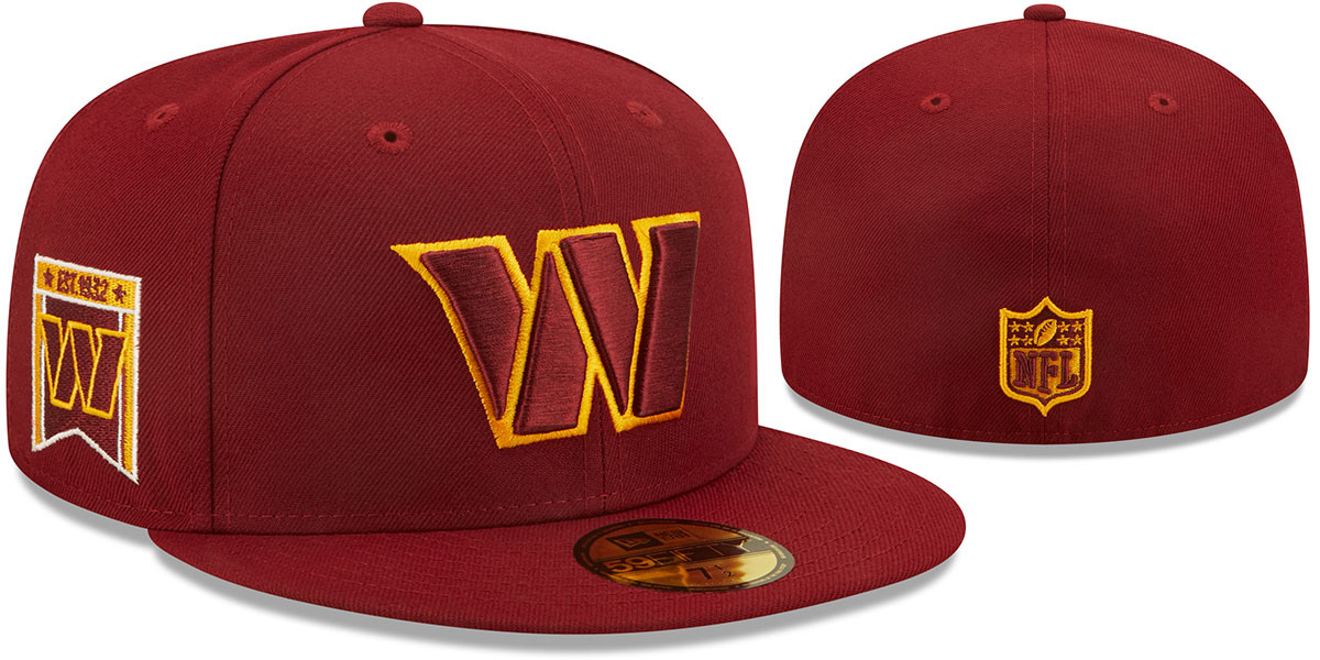 Authentic and Original 59Fifty fitted hat by New Era, team color burgundy authentic poly crown and visor, light grey undervisor, black sweatband, raised embroidered team logo on front, embroidered banner side-patch on side with team logo and established date on side in team colors, embroidered New Era logo on opposite side, matching raised embroidered NFL shield logo on back in team colors . This Washington Commanders hat is made by New Era and is licensed by the NFL - National Football League.