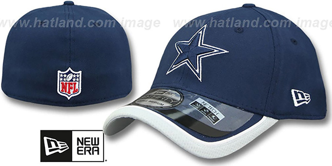 New Era 39THIRTY stretch fit hat with navy blue poly crown and visor with grey edging on brim and white piping, team color undervisor, embroidered team logo on front, NFL shield logo embroidered on back of Flex hat. This Flex 39THIRTY hat fits approximate head sizes (Sm / Med 6 7/8 - 7 1/4) (Med / Lg 7 1/4 - 7 5/8) (Lg / Xlg 7 5/8 - 8 ). This Dallas Cowboys hat is made by New Era and is licensed by the NFL - National Football League.