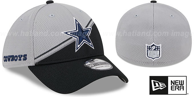 Authentic 39THIRTY lightly structured flex adjustable Dashmark Mesh hat with curved brim by New Era, light grey upper front panels and middle and back panels, black lower front panels and precurved visor, light grey undervisor, raised embroidered team logo on front in team colors with matching diagonal stripes, embroidered New Era logo on side, embroidered secondary logo on opposite side, raised embroidered NFL shield logo on back in team colors, This Flex 39THIRTY hat fits approximate head sizes (Sm / Med 6 7/8 - 7 1/4) (Med / Lg 7 1/4 - 7 5/8) (Lg / XLg 7 5/8 - 8 ), The 39THIRTY Flex hat worn during the beginning of the 2023 NFL season. This Dallas Cowboys hat is made by New Era and is licensed by the NFL - National Football League.