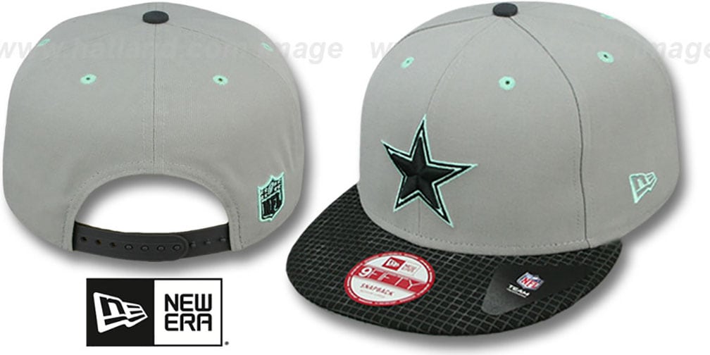 Original fit 9FIFTY adjustable authentic poly hat by New Era that has similar deep crown and flat brim fit as the 59-Fifty, light grey crown with textured grid light black visor, light grey undervisor, raised embroidered team logo on front in mint green and black, New Era flag on side, matching embroidered NFL shield logo on side back by charcoal grey adjustable plastic Snapback strap. This Dallas Cowboys hat is made by New Era and is licensed by the NFL - National Football League.