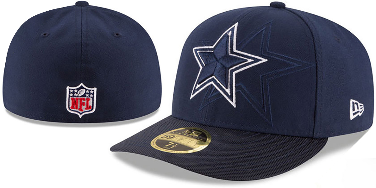 Authentic and low profile 59Fifty fitted hat by New Era with rounded crown and slightly curved brim, navy blue performance poly crown and navy ballistic nylon visor, light grey undervisor, raised embroidered team logo on front with tonal stitched shadow outline of team logo, embroidered New Era flag on side, embroidered NFL shield logo on back. This Dallas Cowboys hat is made by New Era and is licensed by the NFL National Football League.