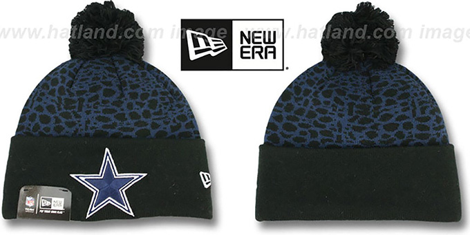 Acrylic ribbed knit black and navy blue Pebble Print crown with black cuff, embroidered team logo on front in navy and white, black pom-pom on top, small New Era Flag embroidery on side. This Dallas Cowboys hat is made by New Era and is licensed by the NFL National Football League.