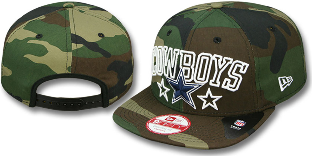 Original fit 9FIFTY adjustable hat by New Era with deep crown and flat brim, army (woodland) camo cotton crown and visor, light grey undervisor, raised embroidered arched team name and team logo with stars on front, New Era logo on side, black arched material on back above black adjustable Snapback strap on back, Adult Size One Size Fits Most. This Dallas Cowboys hat is made by New Era and is licensed by the NFL - National Football League.