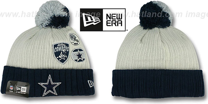 Acrylic ribbed off white (ivory) knit crown with navy blue cuff, embroidered team logo on front, embroidered vintage patches on side front of crown, embroidered New Era Flag on side, team color pom-pom . This Dallas Cowboys hat is made by New Era and is licensed by the NFL National Football League.