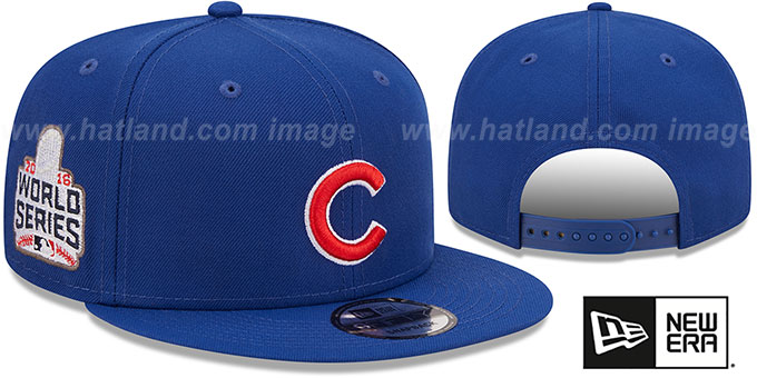 Original fit 9FIFTY adjustable hat by New Era that has similar deep crown and flat brim fit as the 59-Fifty, royal blue authentic poly crown and visor, light grey undervisor, black sweatband, raised embroidered team logo on front, embroidered 2016 WORLD SERIES logo side-patch on side, embroidered New Era logo on opposite side, matching team color adjustable Snapback strap closure. This Chicago Cubs hat is made by New Era and is licensed by the MLB - Major League Baseball.