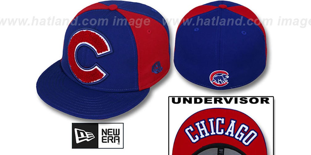 Authentic New Era ORIGINAL 59FIFTY fitted hat, royal blue wool blend front and back panels and visor, red mid panels, red undervisor with arched embroidered city name, raised embroidered Chenille 'LETTERMAN' team logo on front, old school New Era logo on side, matching embroidered team logo on back. This Chicago Cubs baseball cap is made by New Era and is licensed by the MLB Major League Baseball.