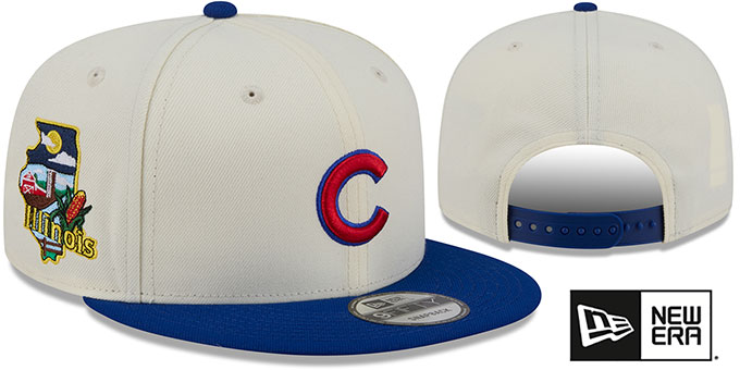 Original 9FIFTY adjustable poly hat by New Era that has similar deep crown and flat brim fit as the 59-Fifty, chrome (cream off white) crown with royal blue visor, kelly green undervisor, raised embroidered team logo on front in team colors, embroidered New Era logo on side, embroidered Localized Illinois state logo on side, team color adjustable Snapback closure. This Chicago Cubs hat is made by New Era and is licensed by the MLB - Major League Baseball.