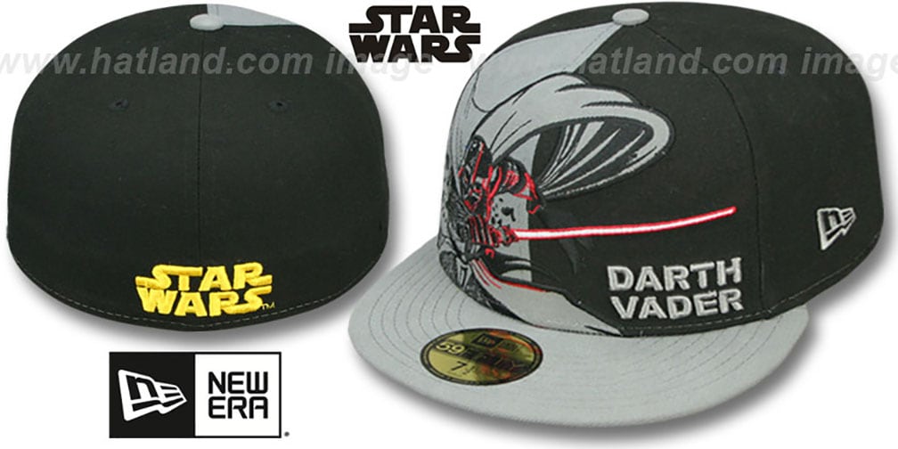 Authentic and Original 59FIFTY authentic poly fitted hat by New Era, black deep crown with medium grey side front panel, grey visor and undervisor, large embroidered Darth Vader image on side front and raised DARTH VADER embroidered on opposite front panel, STAR WARS embroidery on back, Officially licensed STAR WARS hat produced by New Era for the STAR WARS Collection. This Star Wars baseball cap is made by New Era.