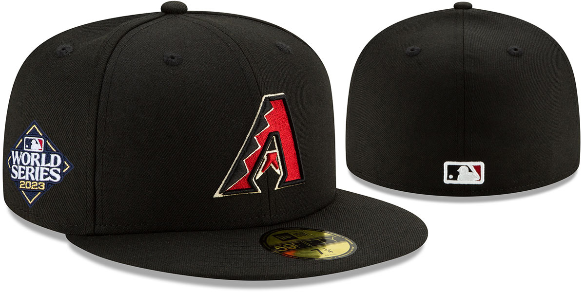 2023 Onfield World Series hat worn during the World Series games, Authentic and ORIGINAL 59FIFTY fitted performance poly hat by New Era, black deep crown and visor, black undervisor, raised embroidered team logo on front, embroidered 2023 WORLD SERIES patch on side, raised embroidered MLB logo on back. This Arizona Diamondbacks baseball cap is made by New Era and is licensed by the MLB - Major League Baseball.