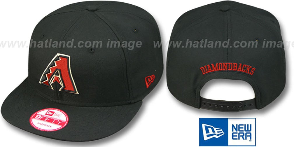 Original fit 9FIFTY adjustable wool hat by New Era that has similar deep crown and flat brim fit as the 59-Fifty, black crown and visor with grey undervisor, raised embroidered team logo on front, embroidered team name on back above secondary team color plastic adjustable Snapback strap This is an Onfield Replica of the style of hat worn by all MLB teams in a Snapback. This Arizona Diamondbacks hat is made by New Era and is licensed by the MLB - Major League Baseball.