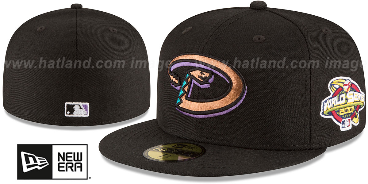 Wow, this New Era 59Fifty wool fitted hat is the real deal! It features a sleek black crown and visor, with a light grey undervisor for a clean, sharp look. The front boasts a raised, embroidered team logo, while the side proudly displays a 2001 WORLD SERIES patch. And to top it all off, there's a raised, embroidered MLB logo on the back. This hat has an authentic, premium feel that any true fan would love. This Arizona Diamondbacks hat is made by New Era and is licensed by the MLB - Major League Baseball.