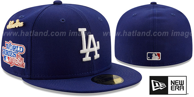 Authentic and Original 59Fifty wool fitted hat by New Era, dark royal blue crown and visor, Cooperstown kelly green undervisor, raised embroidered team logo on front, 1981 WORLD SERIES embroidered side-patch with old school New Era gold pin, embroidered New Era logo on opposite side, embroidered Cooperstown MLB logo on back . This Los Angeles Dodgers hat is made by New Era and is licensed by the MLB - Major League Baseball.