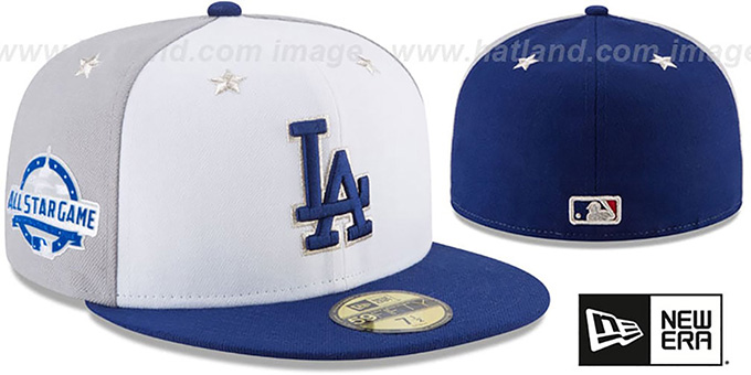 LIMITED QUANTITIES, Authentic and ORIGINAL 59FIFTY fitted onfield poly hat by New Era, white-grey-royal deep crown and royal visor, kelly green undervisor, raised embroidered team logo on front, metallic silver embroidered stars on eyelets, matching 2018 All-Star logo felt patch on side in team colors, matching embroidered New Era logo on opposite side, matching raised embroidered MLB logo on back, This is the hat worn during 2018 All-Star Game in Washington DC. This Los Angeles Dodgers baseball cap is made by New Era and is licensed by the MLB - Major League Baseball.