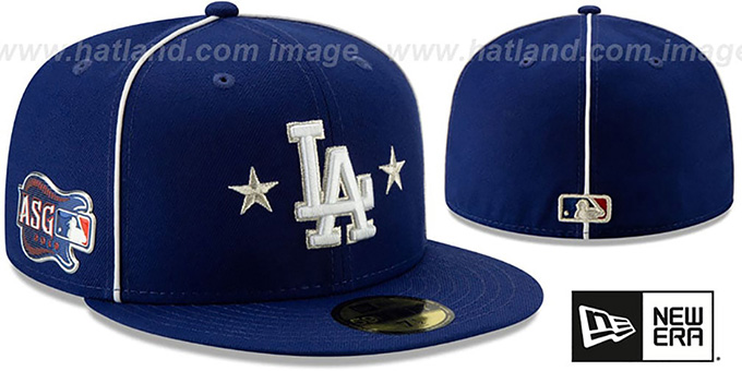 Authentic and ORIGINAL 59FIFTY fitted onfield poly hat by New Era, dark royal blue deep crown and visor and undervisor, white piping on five seams, raised embroidered team logo on front in team color with metallic silver outline and two metallic silver stars, 2019 All-Star CHROMAFLEX logo patch on side in team colors, metallic silver embroidered New Era logo on opposite side, matching raised embroidered MLB logo on back, This is the hat worn during 2019 All-Star Game in Cleveland. This Los Angeles Dodgers baseball cap is made by New Era and is licensed by the MLB - Major League Baseball.