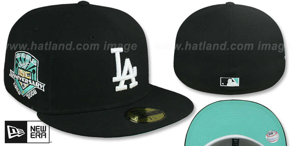 Authentic and ORIGINAL 59FIFTY wool fitted hat by New Era, black crown and visor, clear mint (light) green undervisor-bottom, raised embroidered team logo on front, matching official 50TH ANNIVERSARY embroidered logo on side, matching embroidered Cooperstown MLB logo on back. This Los Angeles Dodgers baseball cap is made by New Era and is licensed by the MLB - Major League Baseball.