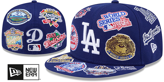 Authentic and ORIGINAL 59Fifty fitted hat by New Era, royal blue authentic poly deep crown and visor with a light grey undervisor, raised embroidered team logo on front, embroidered Cooperstown and associated team logos embroidered ALL-OVER crown and visor, embroidered MLB Batterman logo on back. This Los Angeles Dodgers hat is made by New Era and is licensed by the MLB - Major League Baseball.