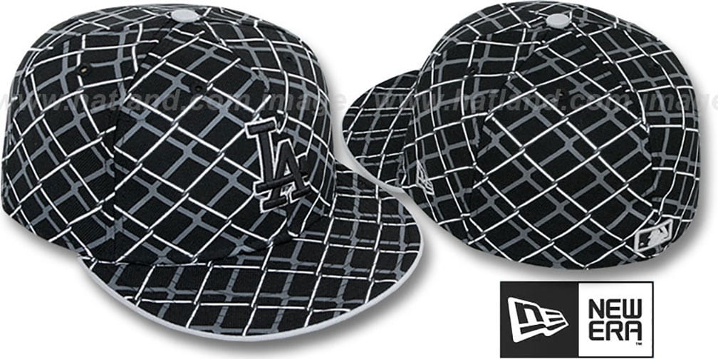 'Authentic' and ORIGINAL 59FIFTY fitted hat by New Era, black wool deep crown and visor with white and grey 'Chain Link Fence' print All-Over deep crown and visor, grey undervisor and flip, matching raised embroidered team logo on front, matching embroidered MLB logo on back.NEFchainlinklosdod-blk. This Los Angeles Dodgers baseball cap is made by New Era and is licensed by the MLB - Major League Baseball.