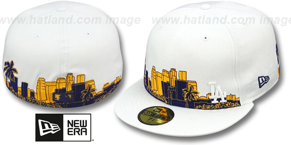 'Authentic' and 'Original' 59FIFTY fitted hat by New Era, white cotton twill deep crown and and visor, raised embroidered 'Flawless' matching team logo on front side, New Era Exclusive 'CITY SKYLINE' embroidery around bottom of front two panels and back two panels in purple and gold, matching 'City Skyline' embroidery on back with MLB logo Dodgers hat made in Lakers colors . This Los Angeles Dodgers baseball cap is made by New Era and is licensed by the MLB - Major League Baseball.