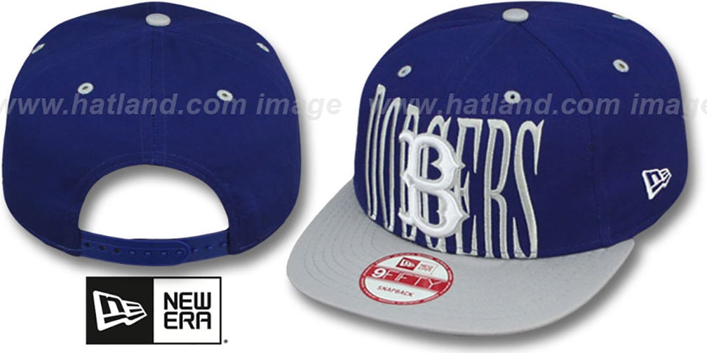 Original 9FIFTY fit adjustable cotton twill hat by New Era that has similar deep crown and flat brim fit as the 59-Fifty, royal blue crown and light grey visor with light grey undervisor, embroidered team name in large block lettering with raised embroidered team logo on front, New Era logo on side, team color plastic adjustable Snapback strap. This item is on SALE!. This Brooklyn Dodgers hat is made by New Era and is licensed by the MLB - Major League Baseball.