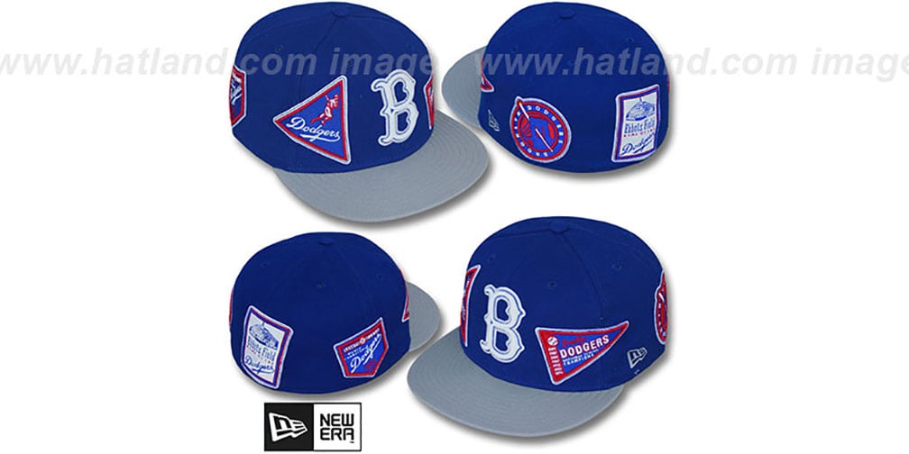 Authentic and ORIGINAL 59FIFTY wool blend fitted hat by New Era, royal blue deep crown and grey visor raised team logo with outlines on front, New Era EXCLUSIVE 'DEEZ PATCHES' raised embroidery all around deep crown featuring oversized different Coopertown logos used throughout the team's history. This Brooklyn Dodgers baseball cap is made by New Era and is licensed by the MLB - Major League Baseball.