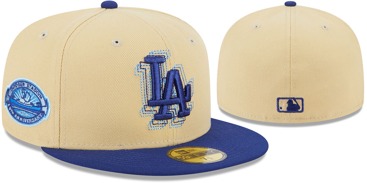 Authentic and ORIGINAL 59FIFTY fitted hat by New Era, vegas gold deep crown and dark royal blue visor, light grey undervisor, raised embroidered team logo on front in dark royal with repeating sky blue stitched outlines, embroidered DODGER STADIUM 50TH ANNIVERSARY patch logo on side in royal and sky, embroidered New Era logo on opposite side, matching embroidered MLB logo on back. This Los Angeles Dodgers baseball cap is made by New Era and is licensed by the MLB - Major League Baseball.