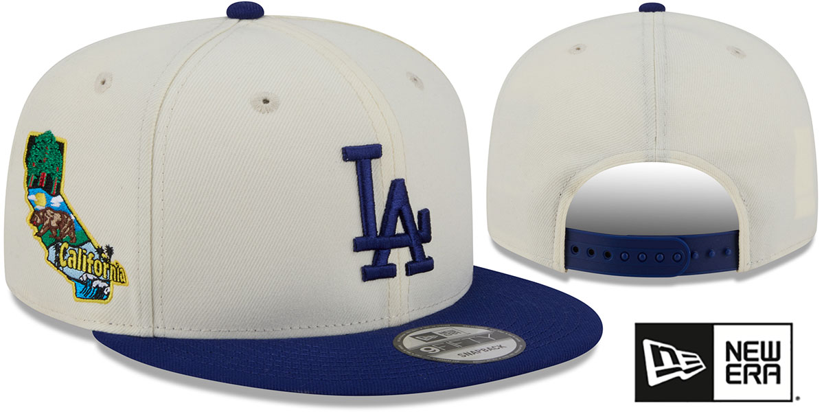 Original 9FIFTY adjustable poly hat by New Era that has similar deep crown and flat brim fit as the 59-Fifty, chrome (cream off white) crown with royal blue visor, kelly green undervisor, raised embroidered team logo on front in team color, embroidered New Era logo on side, embroidered Localized California state logo on side, team color adjustable Snapback closure. This Los Angeles Dodgers hat is made by New Era and is licensed by the MLB - Major League Baseball.