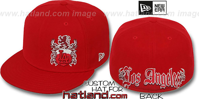 'Authentic' and Original 59FIFTY fitted hat by New Era, red wool deep crown and visor with red undervisor, burgundy-metallic silver-red embroidered Old English Shield with matching team logo on side front panel, oversized matching embroidered OLD ENGLISH font on back.jpg This product is on SALE!. This Los Angeles Dodgers baseball cap is made by New Era and is licensed by the MLB - Major League Baseball.