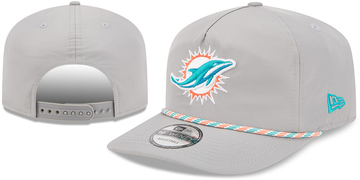 This 19TWENTY adjustable hat by New Era has a relaxed fit crown with pinched front panel construction and a mesh tray insert for light support. It has a poly nylon light grey crown and squared edge pre-curved visor with a team color rope along brim. The undervisor is light grey, and the front sports a raised embroidered team logo in team colors. The side displays a matching embroidered New Era flag, and the back has an adjustable light grey rubber Snapback closure.. This Miami Dolphins hat is made by New Era and is licensed by the NFL - National Football League.