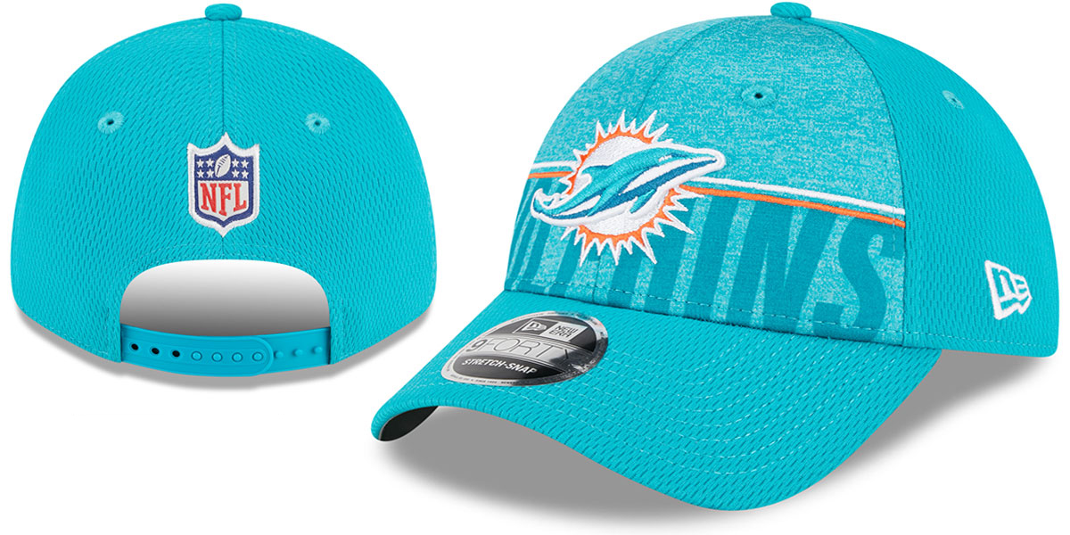 Authentic 9FORTY adjustable snapback hat by New Era with rounded crown and curved brim, team color aqua heather poly mesh front panels with black perforated soft mesh middle and back panels, light grey undervisor, raised embroidered team logo on front and matching embroidered stripes above tonal printed team name, embroidered New Era logo on side, embroidered NFL Shield logo patch on back above matching adjustable Stretch snapback closure, This is the 9FORTY Snapback style of hat worn by all NFL teams during Training Camp of the 2023 season. This Miami Dolphins hat is made by New Era and is licensed by the NFL - National Football League.