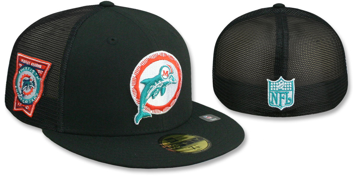 Authentic and Original 59Fifty fitted hat by New Era, black authentic poly front panels and visor with black trucker mesh middle and back panels, light grey undervisor, black sweatband, raised embroidered Throwback team logo on front, matching embroidered 30TH ANNIVERSARY logo side-patch of the 17-0 undefeated season on side in official colors, matching embroidered New Era logo on opposite side, matching raised embroidered NFL shield logo in team colors on back. This Miami Dolphins hat is made by New Era and is licensed by the NFL - National Football League.