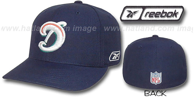 NFL coaches sideline hat, Authentic structured Reebok fitted hat, navy wool crown and visor, embroidered team logo on front, Reebok logo on side, NFL shield logo on back.RBKcoachmiadol-nvy. This Miami Dolphins hat is made by Reebok and is licensed by the NFL - National Football League.